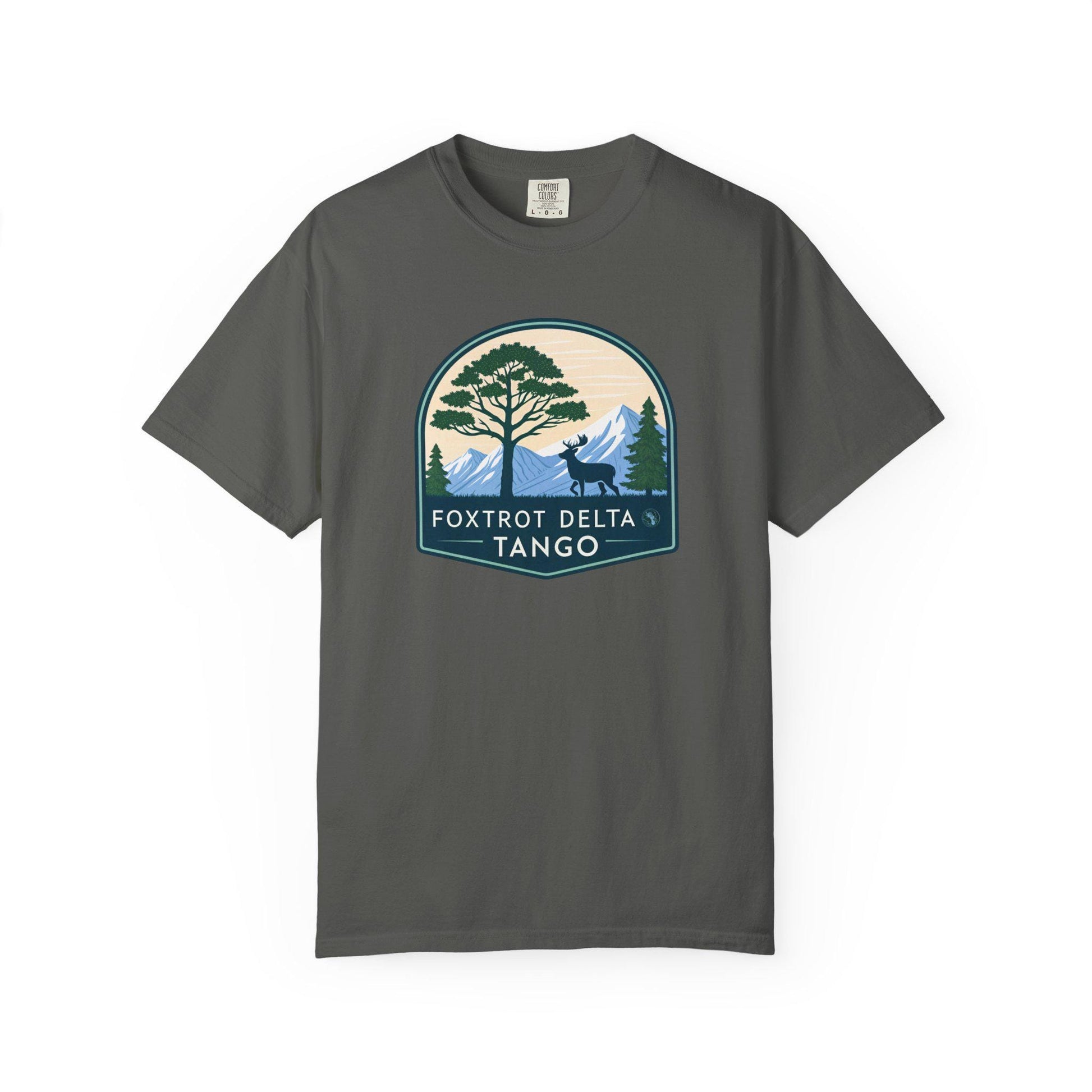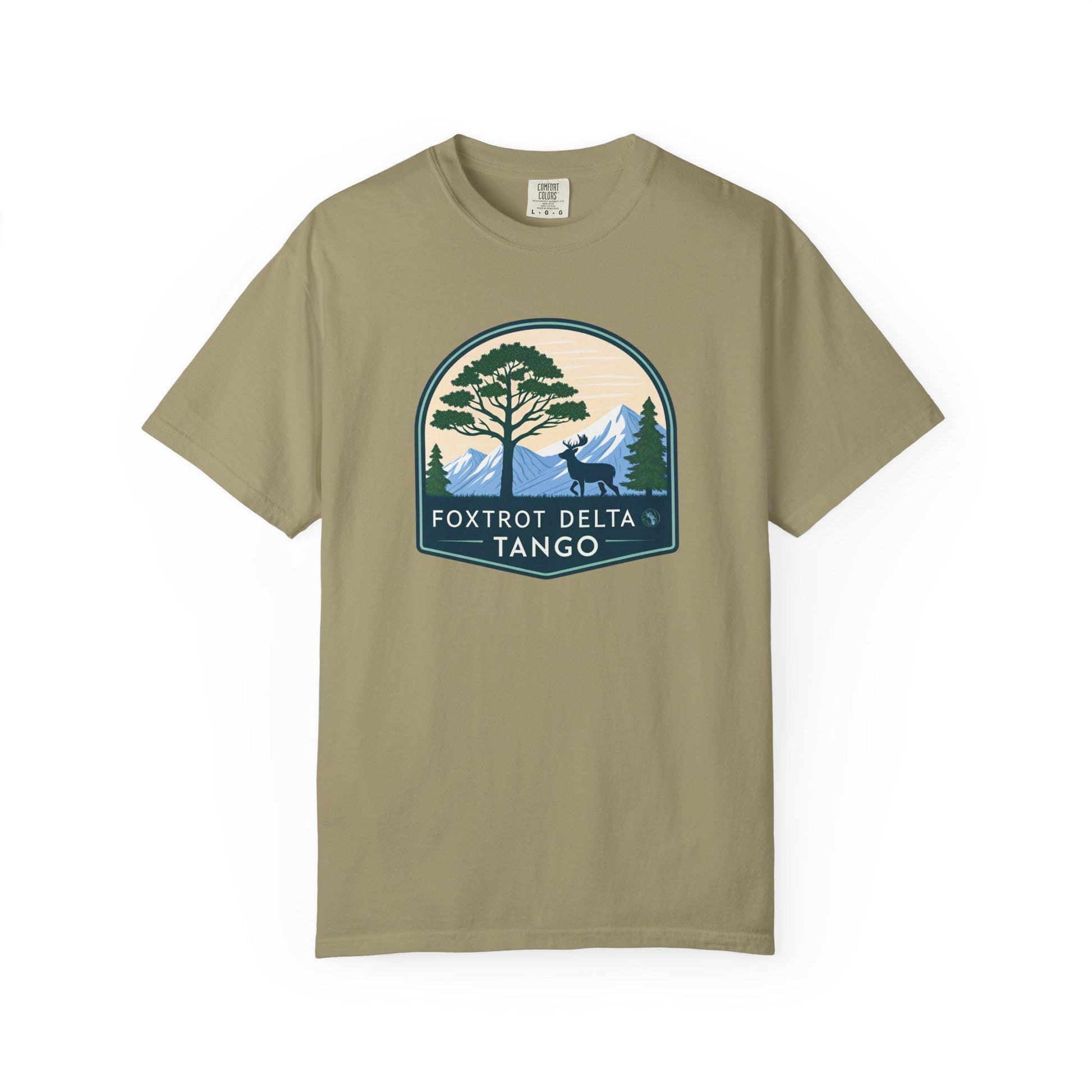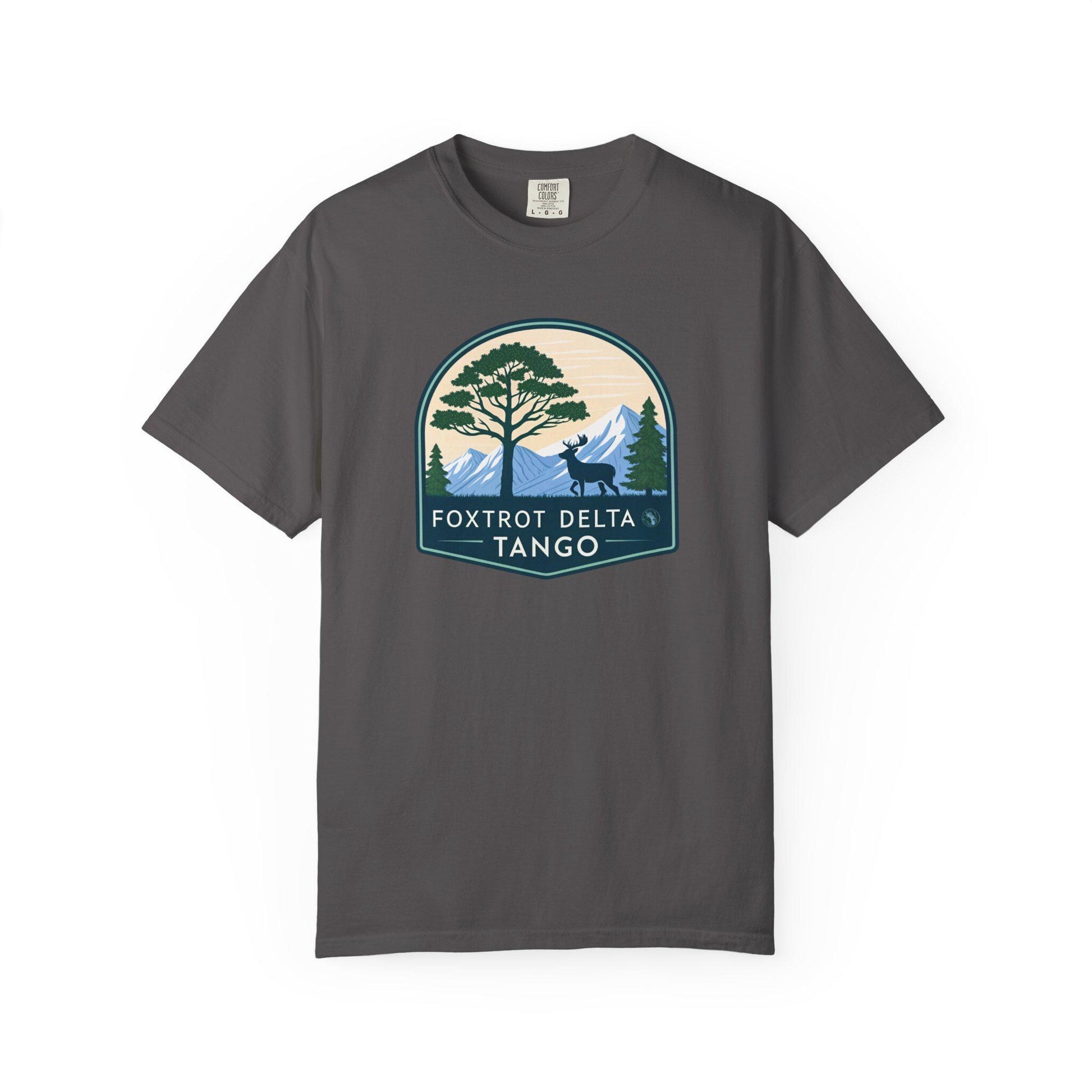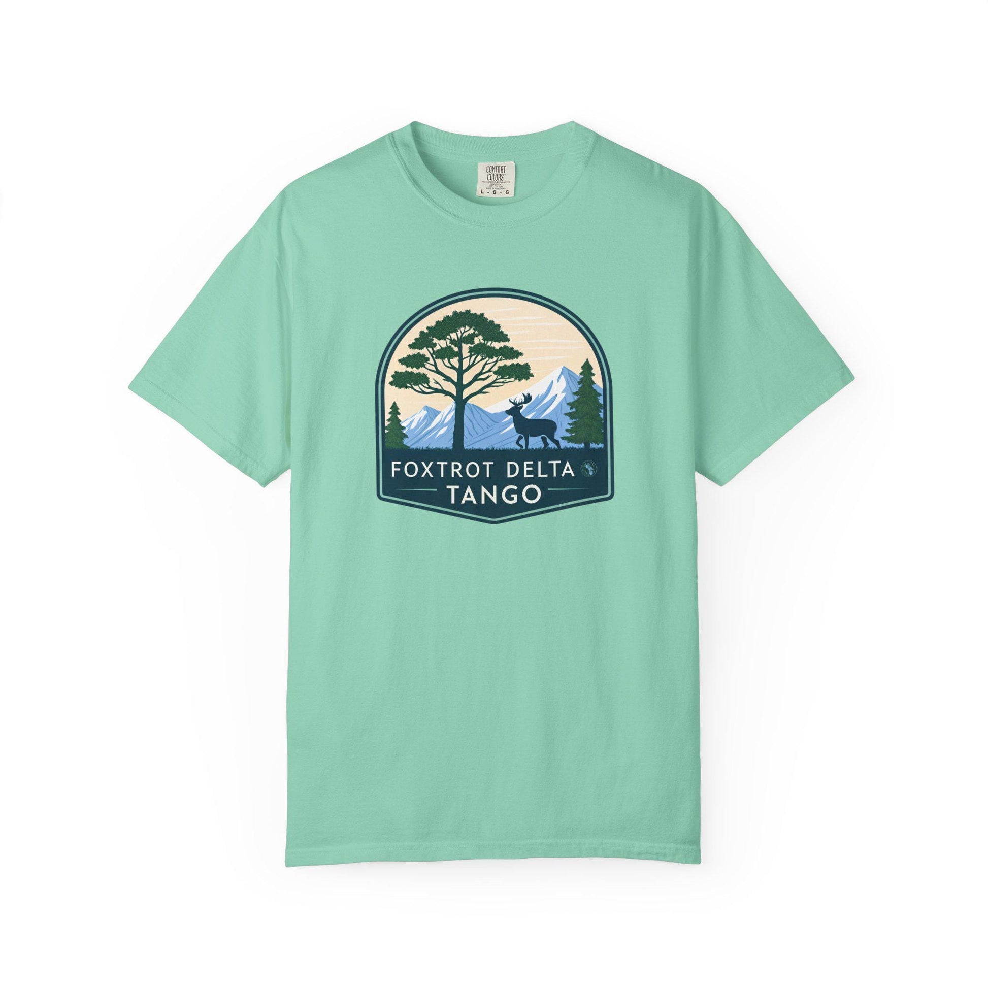 Show your love for the great outdoors with this Foxtrot Delta Tango Nature T-Shirt, designed for those who find peace in the pines and strength in the mountains. Featuring a scenic graphic of trees, mountains, and a majestic deer, this unisex garment-dyed tee is the perfect blend of rugged charm and everyday comfort.