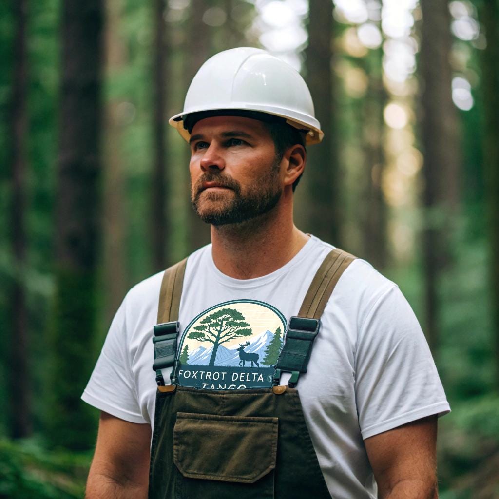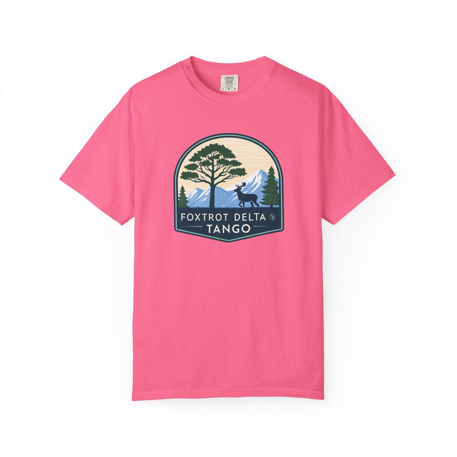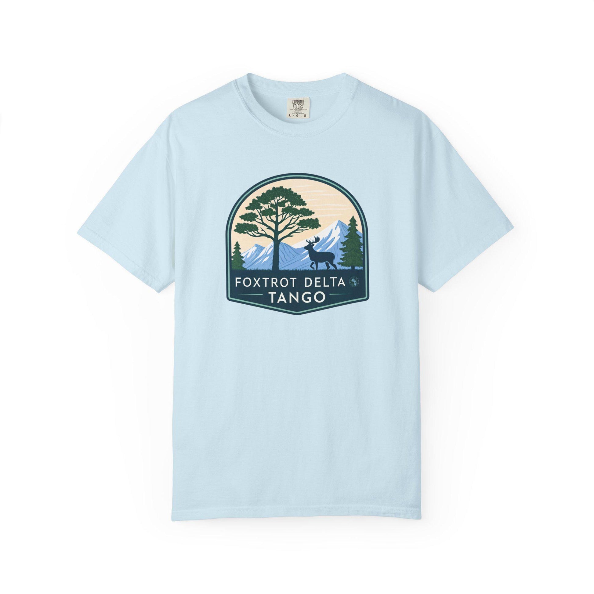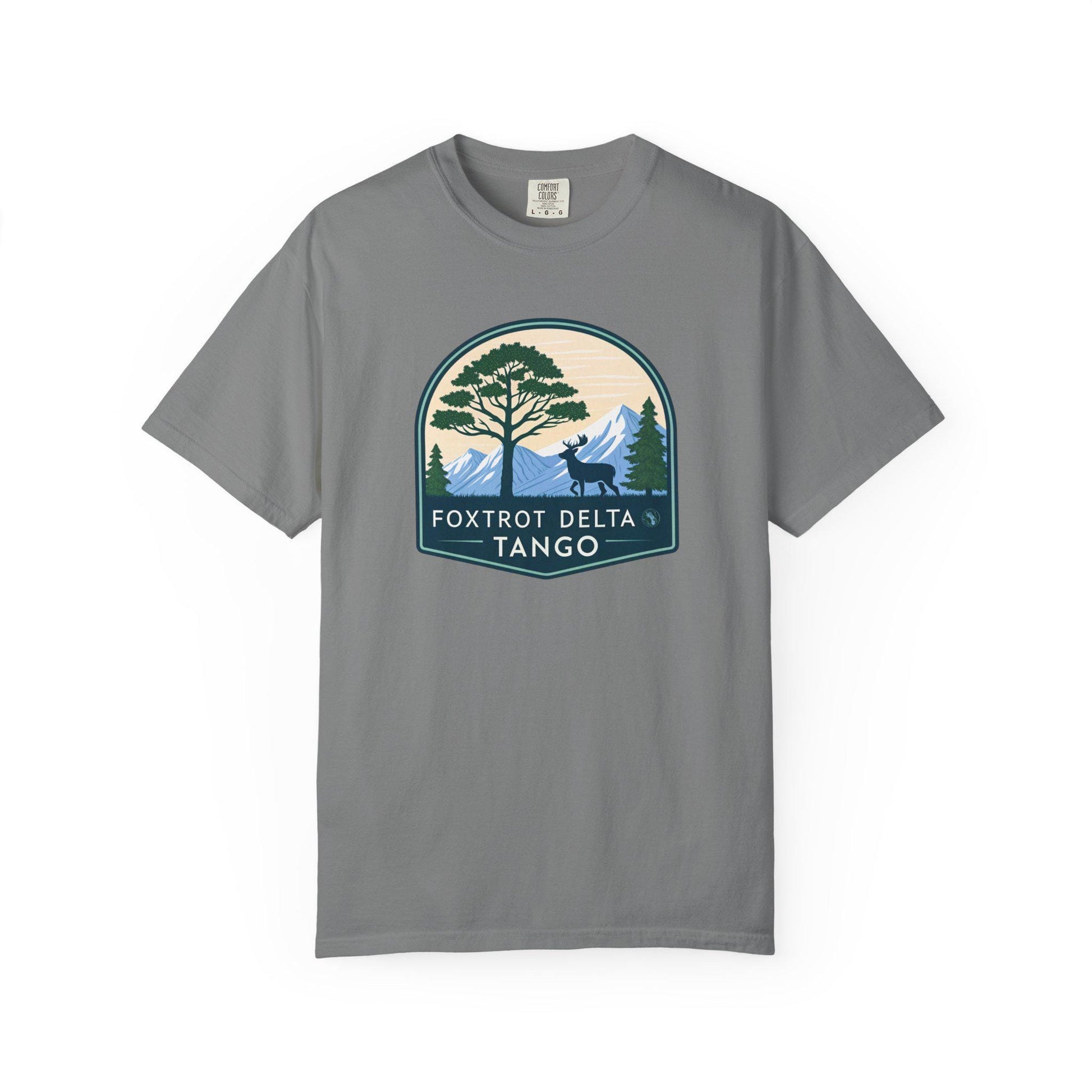 Show your love for the great outdoors with this Foxtrot Delta Tango Nature T-Shirt, designed for those who find peace in the pines and strength in the mountains. Featuring a scenic graphic of trees, mountains, and a majestic deer, this unisex garment-dyed tee is the perfect blend of rugged charm and everyday comfort.
