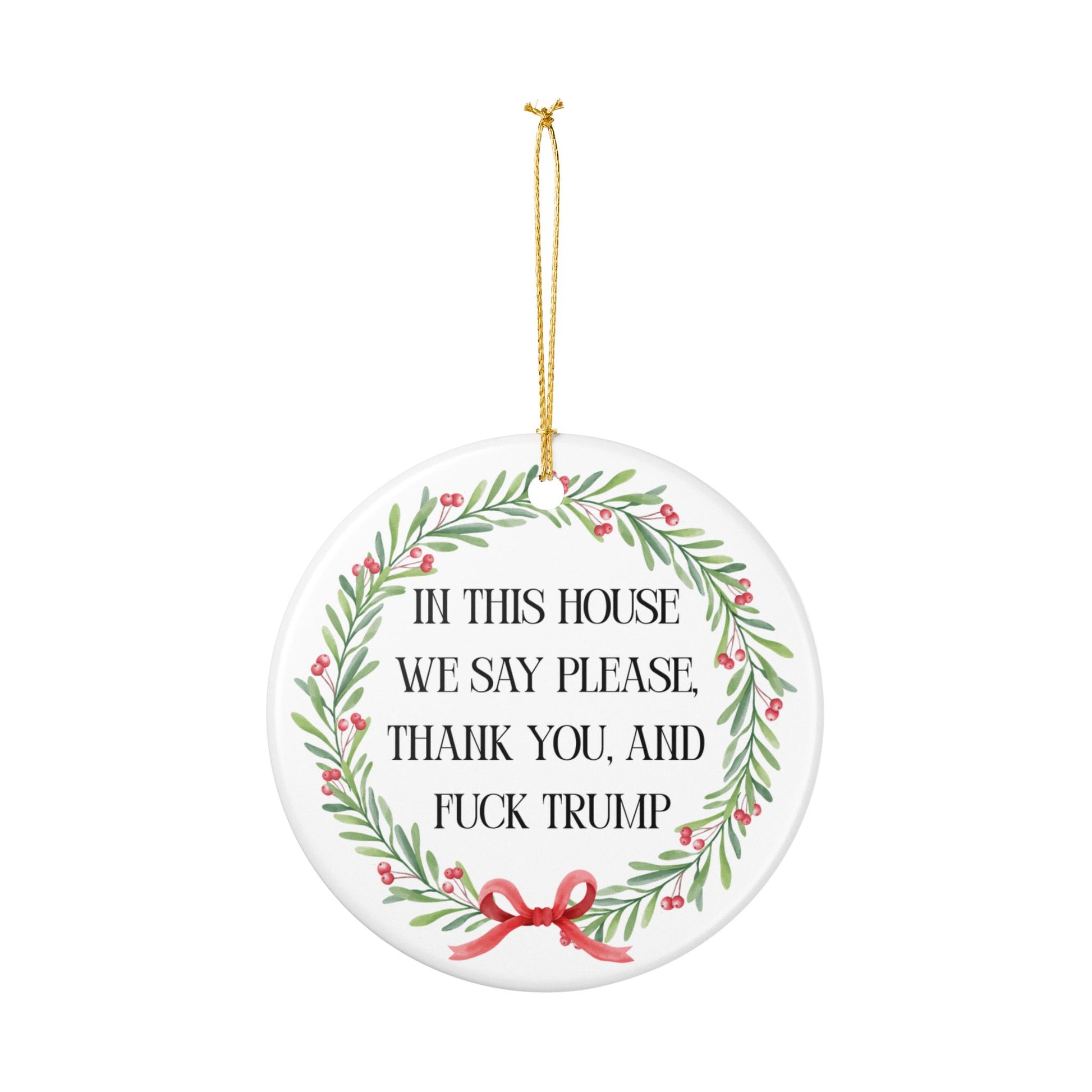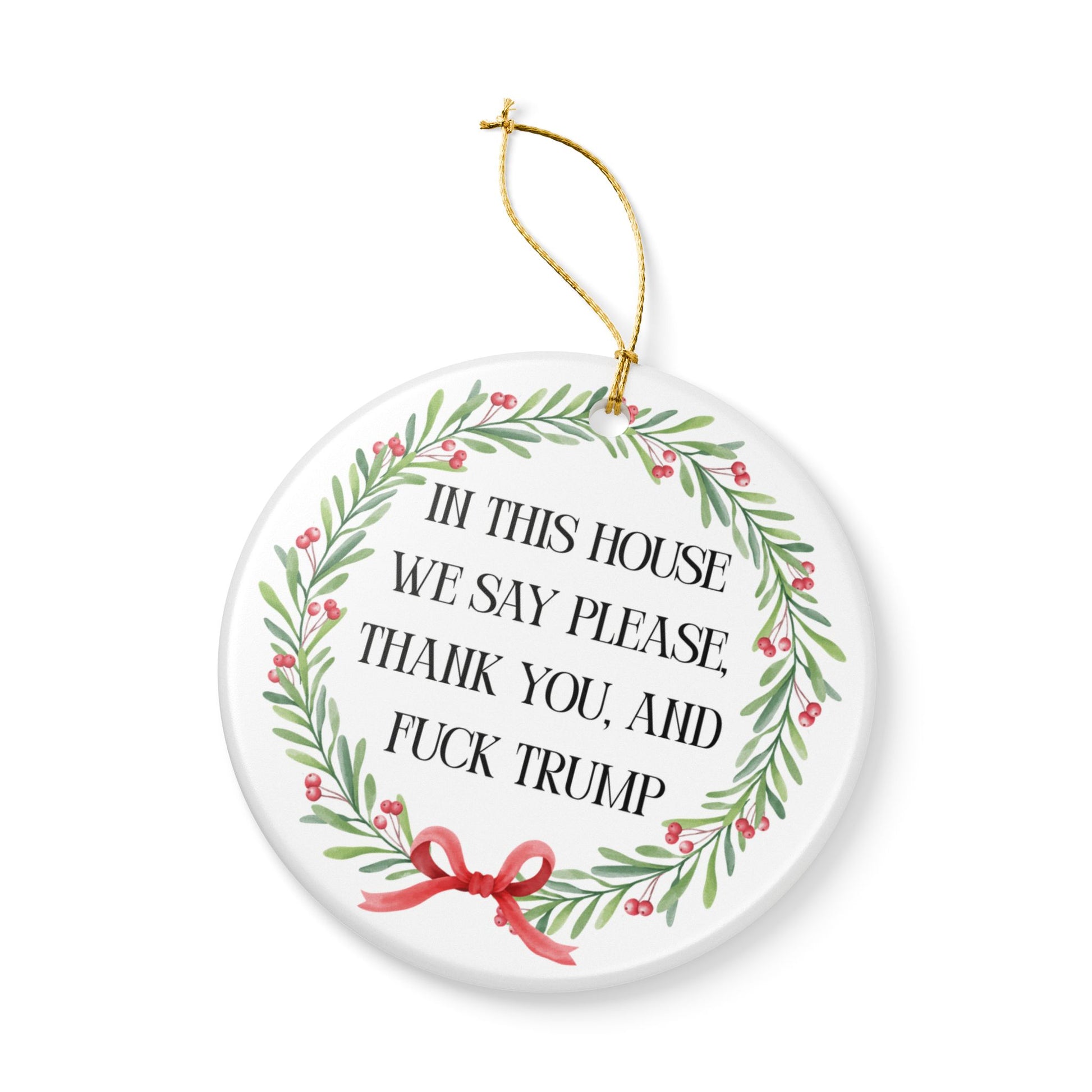 In This House We Say Please Thank You & Fuck Trump — Ceramic Statement Ornament / Wreath Decoration